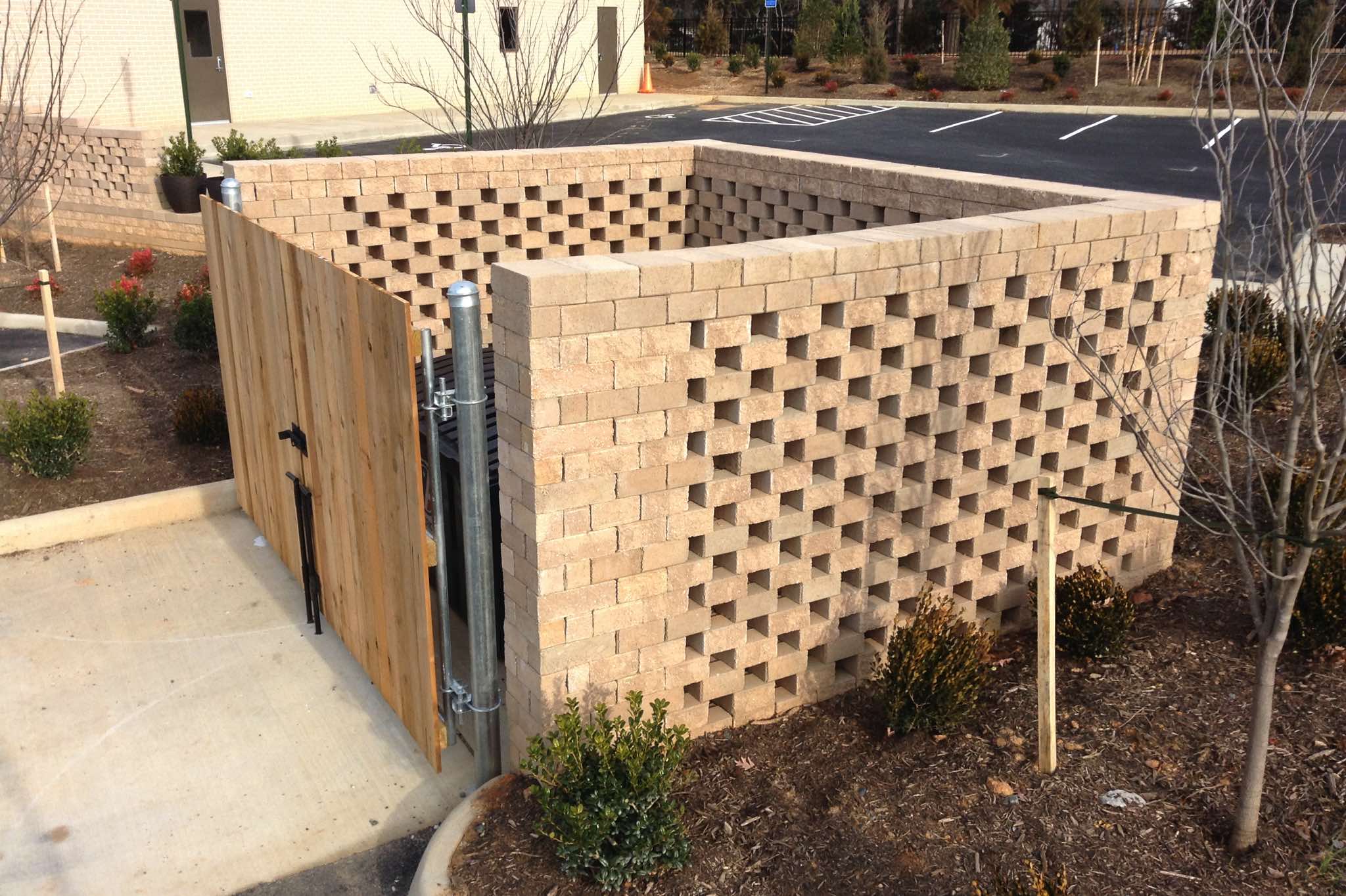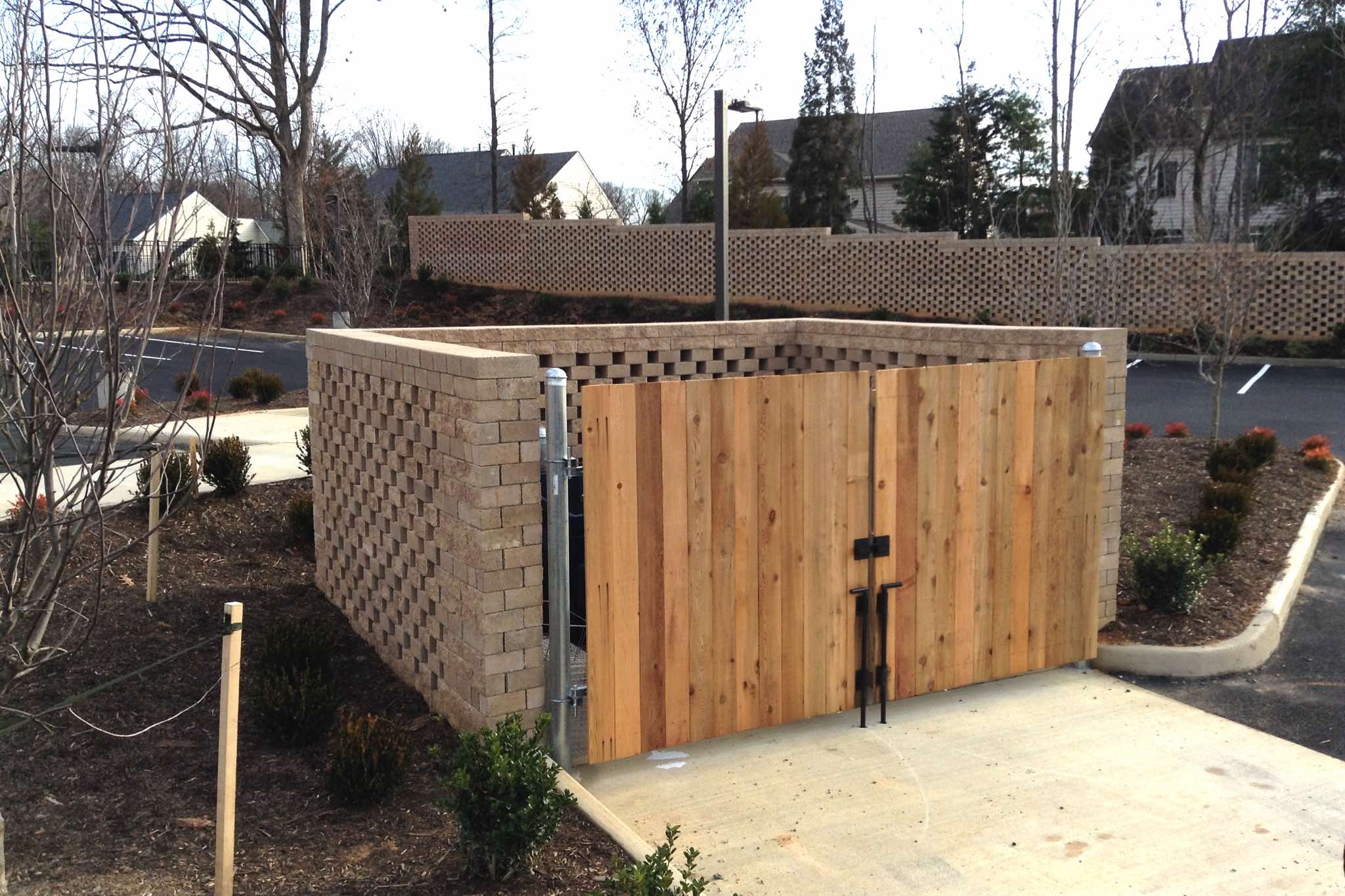Quickly-assembled TERRASTOP® enclosures around A/C equipment and commercial trash dumpsters offer exceptional strength and durability. When built with perforated surfaces, they allow visual inspection of the enclosure interior, enhancing site security and keeping dumpsters and equipment well ventilated.